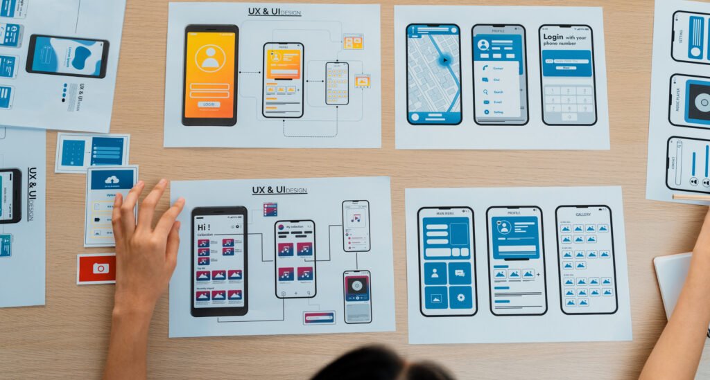 Top view panorama banner of startup company employee planning on user interface prototype for mobile application or website in office. UX UI designer brainstorm user friendly interface plan. Synergic